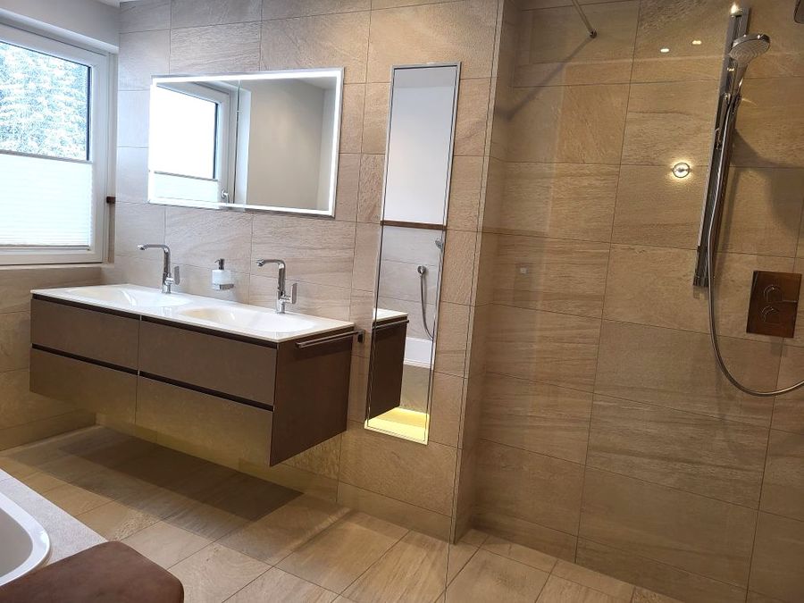 Free Wi-Fi, Modern bathroom with double washbasins, shower and bath, hairdryer, make-up mirror and towel warmer.